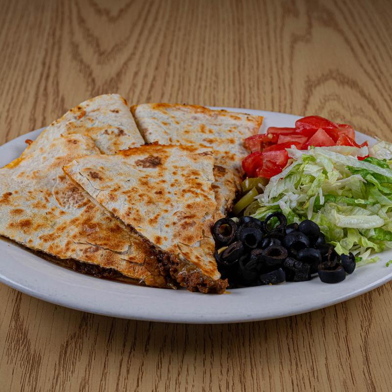 Seasoned beef or chicken, shredded lettuce, cheddar jack cheese, black olives, jalapeños, tomatoes. Served with a side of sour cream and salsa.